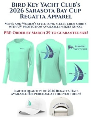The 2026 Sarasota Bay Cup will be held on April 11. The Regatta is open to all mono-hull and multi-hull PHRF boats plus American 18, Flying Scot, Sunfish and Melges 15.